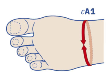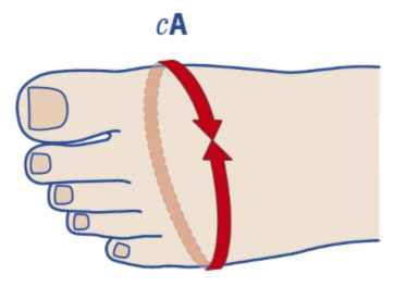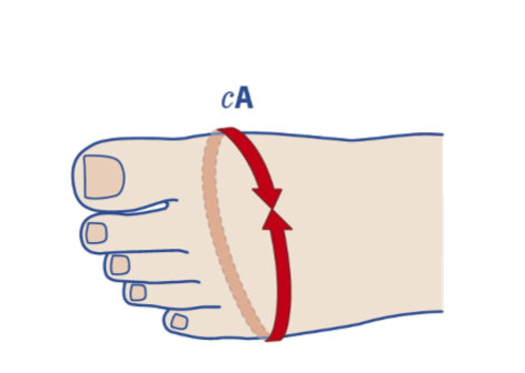 Circonferenza alla base delle dita. Applicare il metro intorno alla giuntura metatarso falangea.