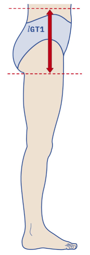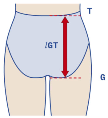 Misurare la lunghezza dal punto G (plica glutea) al punto T. Il metro deve seguire il contorno anatomico del gluteo.