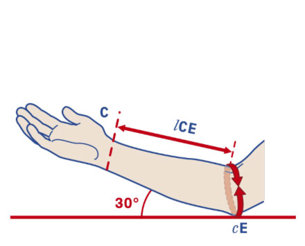 E: rilevare sulla plica del gomito con gomito flesso a 30°.