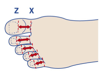 Proiettare il margine inferiore dell'unghia sulla pianta del piede. Misurare quindi la lunghezza dal punto X al punto Z.