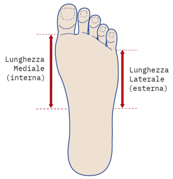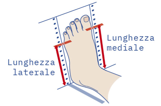 Misurare la lunghezza mediale (dal tallone alla giuntura metatarso falangea del primo dito) e misurare la lunghezza laterale (dal tallone alla giuntura metatarso falangea del quinto dito).