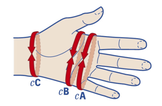 C: al polso, all'altezza dello stiloide.